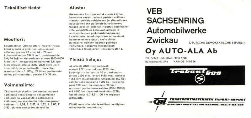 Der Pospekt des VEB Sachenring Automobilwerke Zwickau stammt in etwa aus dem Jahr 1963. Die Beschreibungen und Darstellungen erschienen in Finnland.